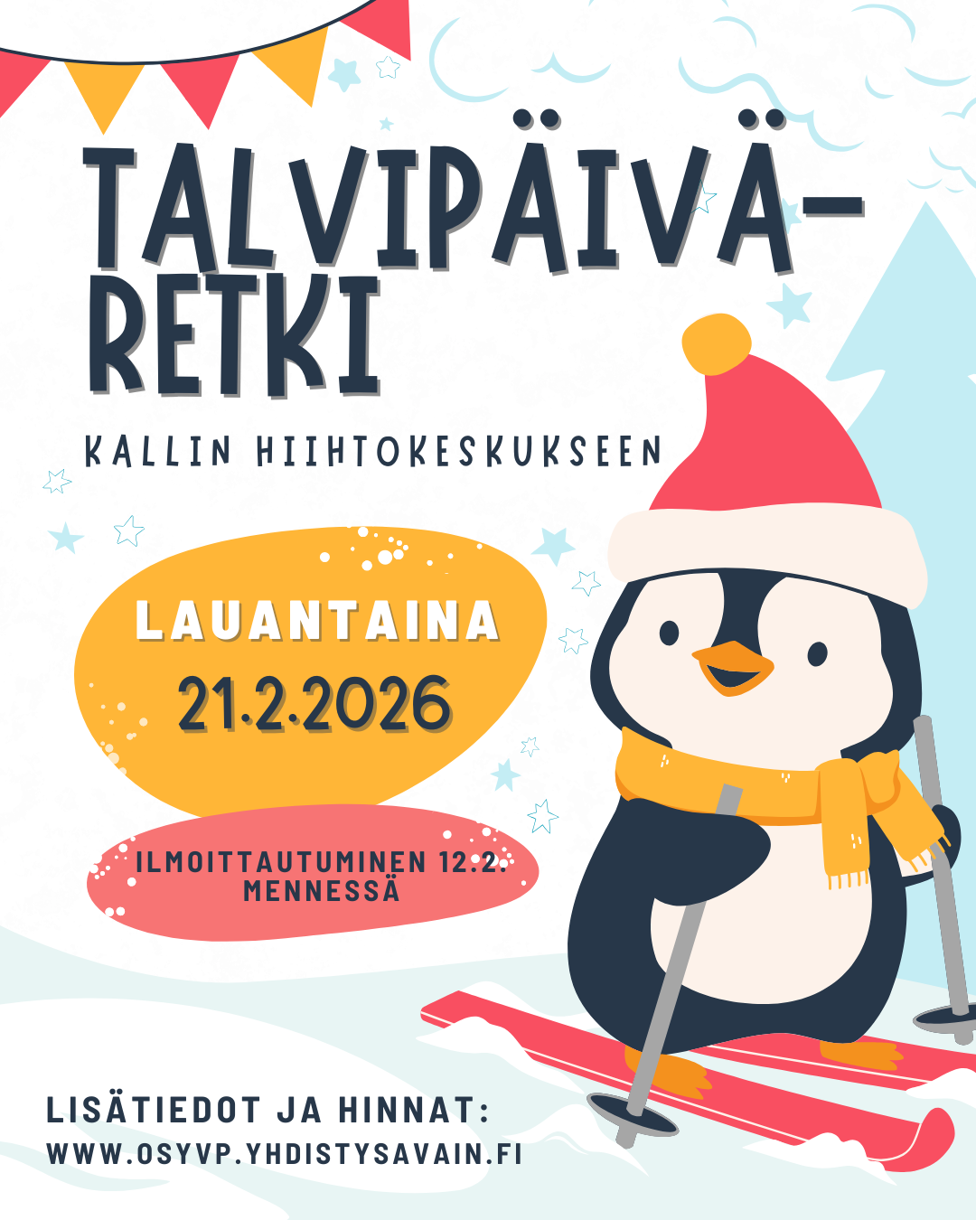OSYVP ry kutsuu jäsenperheet ja muut kiinnostuneet mukaan talvipäiväretkelle Kallin Hiihtokeskukseen! ❄️ Luvassa on mukava yhteinen päivä, helppo bussikuljetus Oulusta ja retkieväät kaikille.